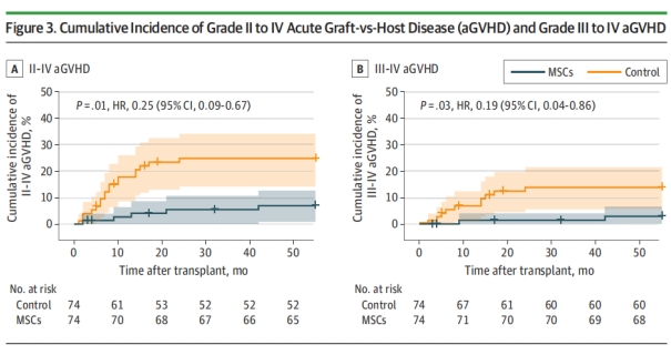 MSCs组III级-IV级aGVHD发生率显著降低,为2.7%(95% CI,0.5%-9.3%),对照组为13.5%(95%CI,7.5%-23.1%)。在II-IV级aGVHD和III-IV级aGVHD中,MSCs组累积发病曲线低于对照组(图3A.图3B)。