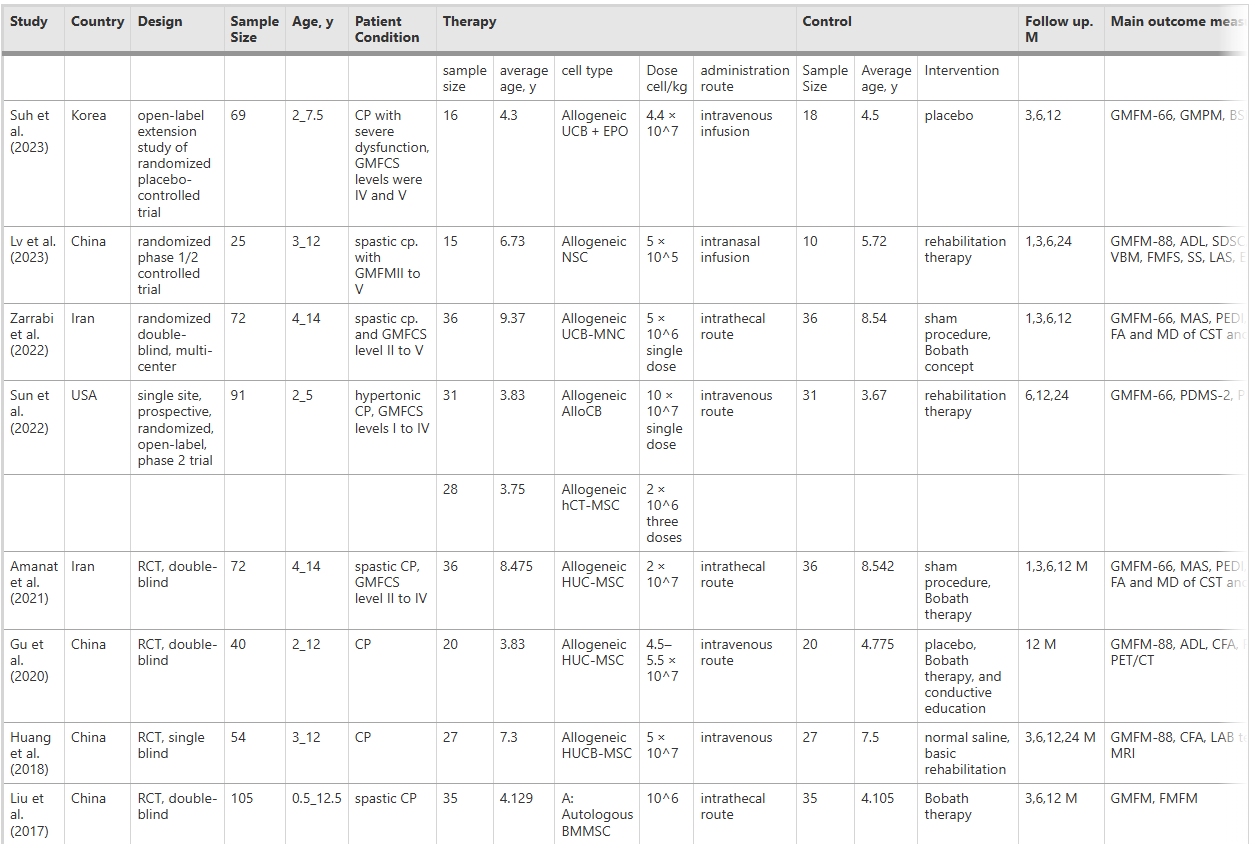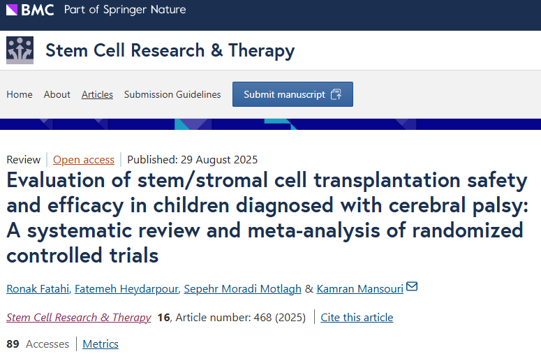 参考资料:[1]:Fatahi R, Heydarpour F, Motlagh SM, Mansouri K. Evaluation of stem/stromal cell transplantation safety and efficacy in children diagnosed with cerebral palsy: A systematic review and meta-analysis of randomized controlled trials. Stem Cell Res Ther. 2025 Aug 29;16(1):468. doi: 10.1186/s13287-025-04550-9. PMID: 40877893; PMCID: PMC12395659.