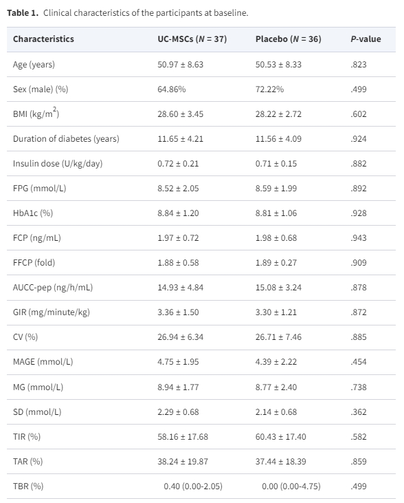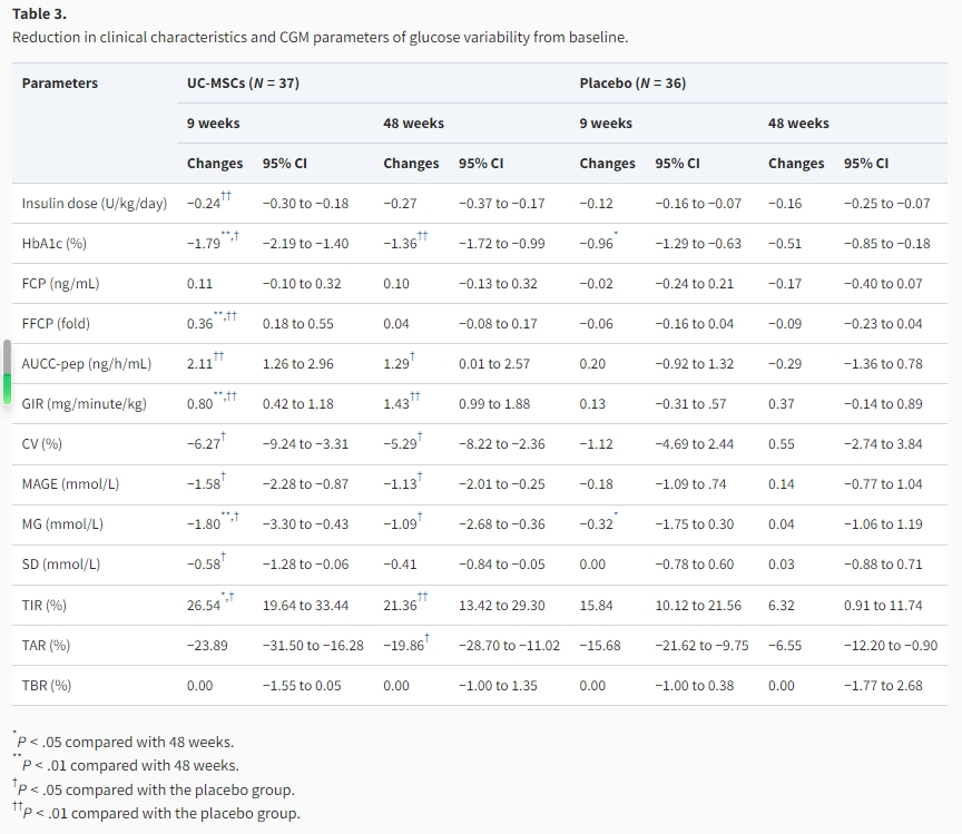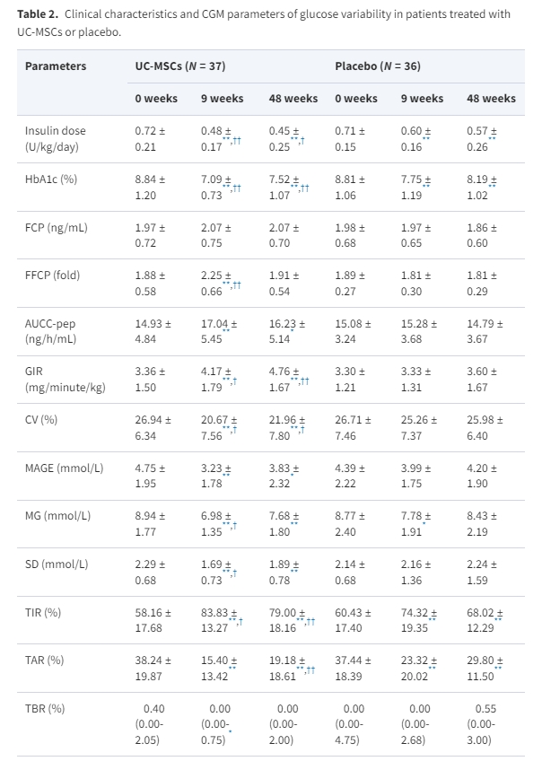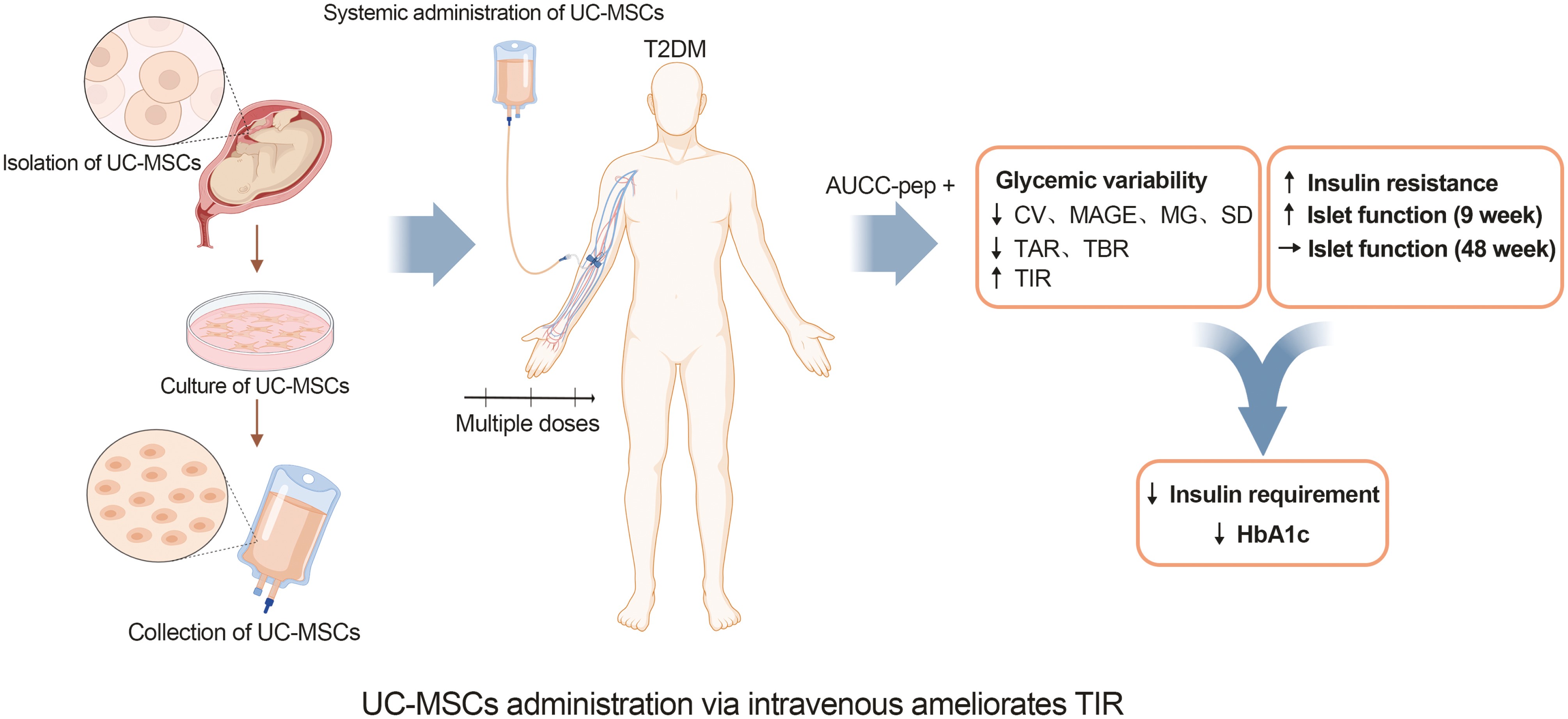 这项前瞻性、单中心、随机、双盲、安慰剂对照试验证明,通过静脉输注脐带间充质干细胞可有效改善TIR和血糖变异性。