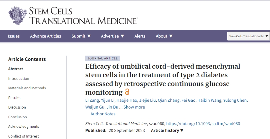 参考资料:Li Zang, Yijun Li, Haojie Hao, Jiejie Liu, Qian Zhang, Fei Gao, Haibin Wang, Yulong Chen, Weijun Gu, Jin Du, Junhua Meng, Saichun Zhang, Zhaohui Lyu, Jingtao Dou, Yiming Mu, Efficacy of umbilical cord-derived mesenchymal stem cells in the treatment of type 2 diabetes assessed by retrospective continuous glucose monitoring, Stem Cells Translational Medicine, 2023;, szad060, https://doi.org/10.1093/stcltm/szad060