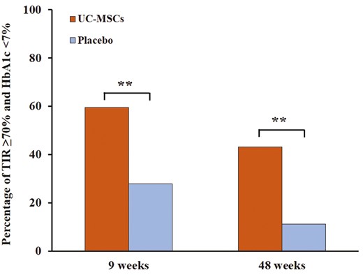 TIR≥70%和HbA1c<7%的患者比例。与安慰剂组相比,脐带-间充质干细胞组有更多的患者在9周和48周时都达到了TIR≥70%和HbA1c<7%的血糖控制目标。