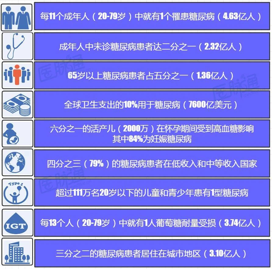 全球糖尿病患者中有32%患有心血管疾病;超过80%的终末期肾脏疾病是由糖尿病或高血压或两者同时引起;糖尿病足和下肢并发症影响4000万~6000万糖尿病患者。