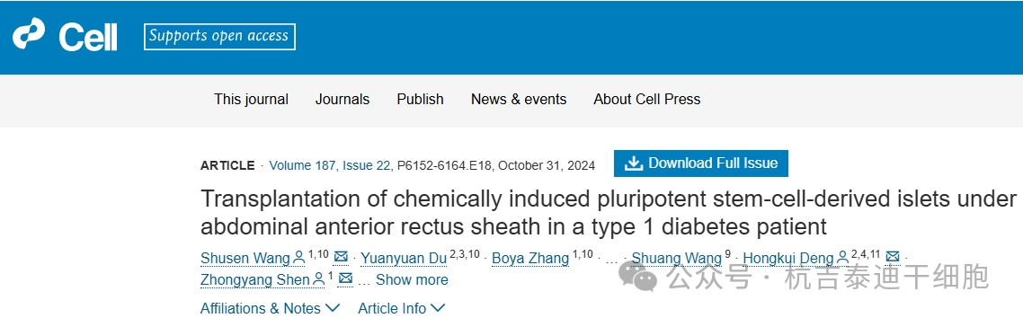 2.Wang S, Du Y, Zhang B, Meng G, Liu Z, Liew SY, Liang R, Zhang Z, Cai X, Wu S, Gao W, Zhuang D, Zou J, Huang H, Wang M, Wang X, Wang X, Liang T, Liu T, Gu J, Liu N, Wei Y, Ding X, Pu Y, Zhan Y, Luo Y, Sun P, Xie S, Yang J, Weng Y, Zhou C, Wang Z, Wang S, Deng H, Shen Z. Transplantation of chemically induced pluripotent stem-cell-derived islets under abdominal anterior rectus sheath in a type 1 diabetes patient. Cell. 2024;187:6152–6164.e18. doi: 10.1016/j.cell.2024.09.004. [DOI] [PubMed] [Google Scholar]