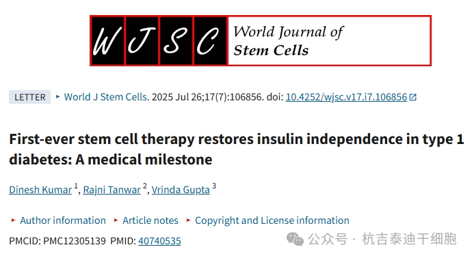 2025年7月26号,知名医学期刊杂志《World J Stem Cells》刊发了一篇“干细胞疗法首次实现了1型糖尿病患者的胰岛素独立:医学里程碑”的文献综述。