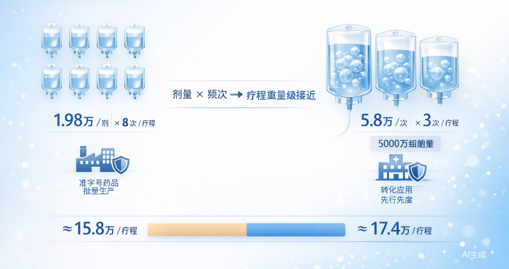 “上市药品”与“特许技术”的区别:1.98万元对应的是已获批上市、可批量生产的标准化药品;5.8万元对应的是在先行区开展、按个体化制备与监护的临床转化技术,包含更精细的工艺、质检与医疗管理成本。