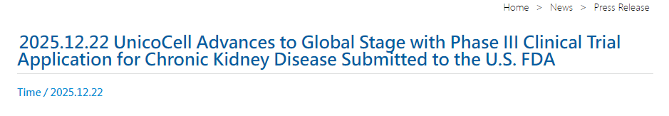 12月22日,UnicoCell Biomed Co., Ltd.宣布,已向美国食品药品监督管理局(FDA)提交其同种异体脂肪来源间充质干细胞新药ELIXCYTE®用于治疗慢性肾脏病(CKD)的Ⅲ期临床试验IND申请,标志着该项目正式迈入全球关键临床阶段。[11]