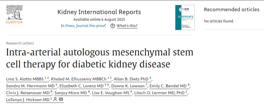 近日,美国梅奥诊所在国际权威期刊杂志《肾脏国际报告》上发表了一项关于“动脉内自体间充质干细胞治疗糖尿病肾病”临床研究的文章[1]。
