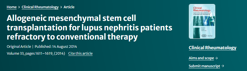 [1]Gu, F., Wang, D., Zhang, H. et al. Allogeneic mesenchymal stem cell transplantation for lupus nephritis patients refractory to conventional therapy. Clin Rheumatol 33, 1611–1619 (2014). https://doi.org/10.1007/s10067-014-2754-4