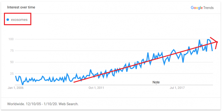 目前已发表了至少26,805 篇有关外泌体的科学文章,并且正在进行301项临床试验,这些小囊泡在一系列治疗应用中具有令人着迷的潜力。过去10年,“外泌体”一词已成为Google上越来越常见的搜索词,如下图所示: