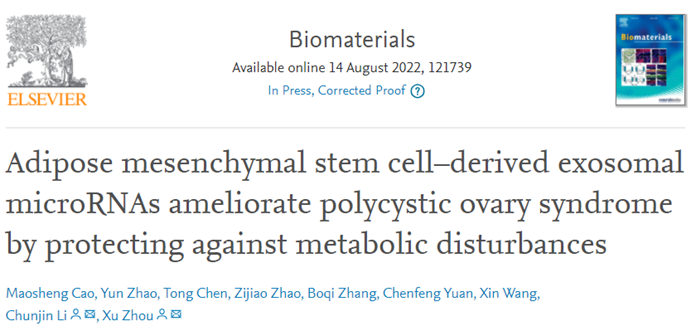 2022年8月14日,吉林大学周虚教授、李纯锦教授团队在国际权威杂志Biomaterials上发表题为“Adipose mesenchymal stem cell-derived exosomal microRNAs ameliorate polycystic ovary syndrome by protecting against metabolic disturbances”的研究论文(2022, 14:121739),阐述了脂肪间充质干细胞外泌体通过防止代谢紊乱改善多囊卵巢综合征的机制。