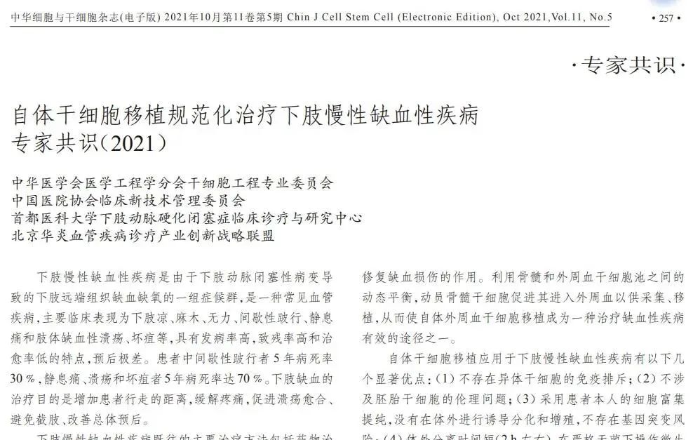 2021年10月在《中华细胞与干细胞杂志( 电子版》(第11第5期 上发表的《自体干细胞移植规范化治疗下肢慢性缺血性疾病专家共识( 2021)》,其中提到,自体干细胞移植对下肢慢性缺血性疾病治疗的安全性和有效性已成为学界公认。
