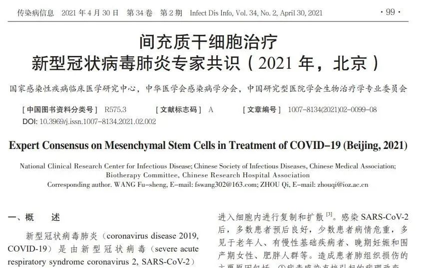 2021年,《传染病信息)》 杂志发表了我国首个《间充质干细胞治疗新型冠状病毒肺炎专家共》对间充质干细胞治COVID-19提出了建议,包括了患者的选择、细胞输注的准备、细胞输注的监测和不良反应处理、疗效评价指标等。