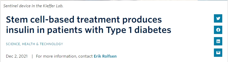 “温哥华试验基地首席研究员、卑诗大学内分泌学临床教授兼温哥华总医院糖尿病中心主任大卫-汤普森博士说:”这是朝着功能性治愈1型糖尿病迈出的重要一步。“干细胞首次减少了一些1型糖尿病试验参与者所需的胰岛素量。随着这种方法的进一步完善,我们迟早会有一种疗法,可以完全消除每天注射胰岛素的需要”。
