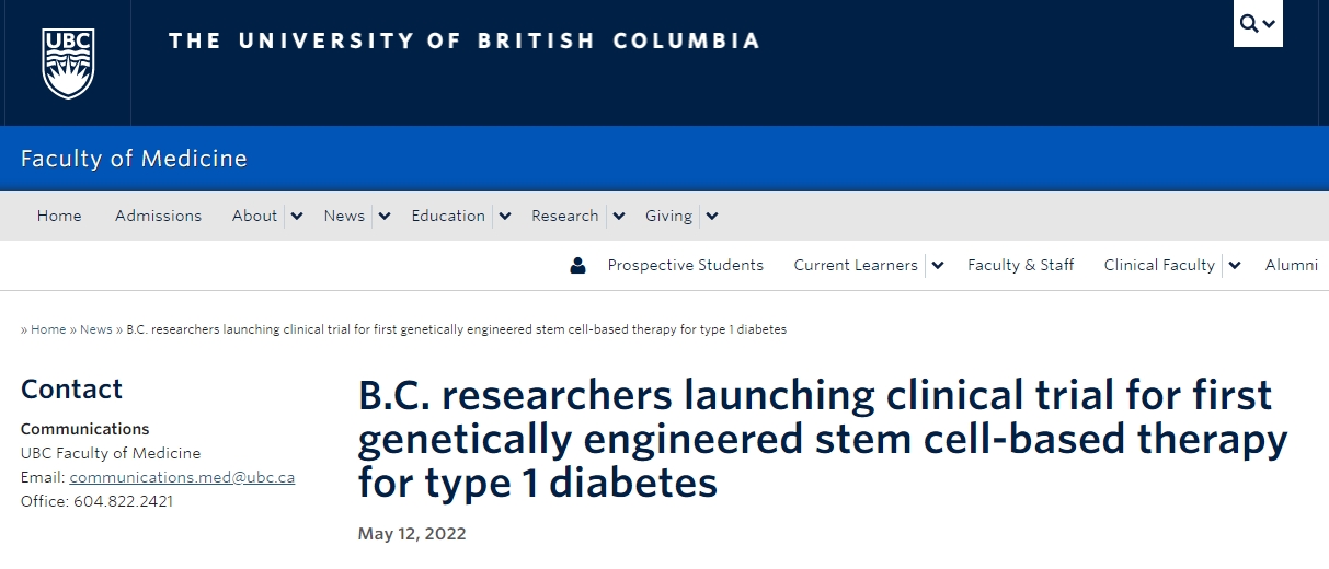 根据不列颠哥伦比亚大学(UBC)和温哥华海岸医疗中心(VCH)的最新临床试验结果,一种基于干细胞治疗1型糖尿病得创新疗法可以有效调节血糖水平,减少对每日注射胰岛素的依赖。