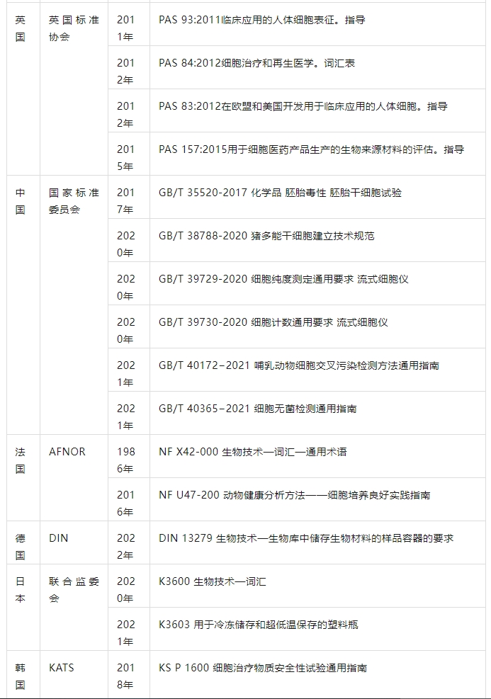 英国标准协会(BSI)成立于1901年,是世界上第一个国家标准机构,也是英国政府指定的国家标准机构。为了促进英国干细胞研究的快速发展,BSI公开发布了多项SCT相关规范文件,帮助提高细胞产品、服务和系统的质量和安全性。这些文件不仅涵盖了细胞治疗和再生医学行业相关法规中的术语和定义,还为基于干细胞的再生医学产品的开发提供了指导和建议。