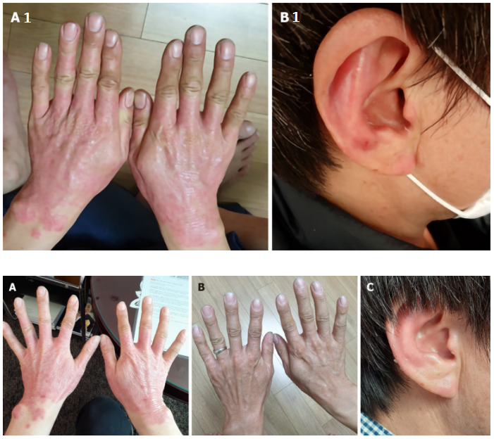 图:A1,B1为治疗前,A治疗后15天,B、C治疗后122天,可见红斑已消退在治疗过程中,该患者未出现包括皮炎、发烧、发冷或恶心等不良反应,证实了间充质干细胞治疗的安全性和有效性。