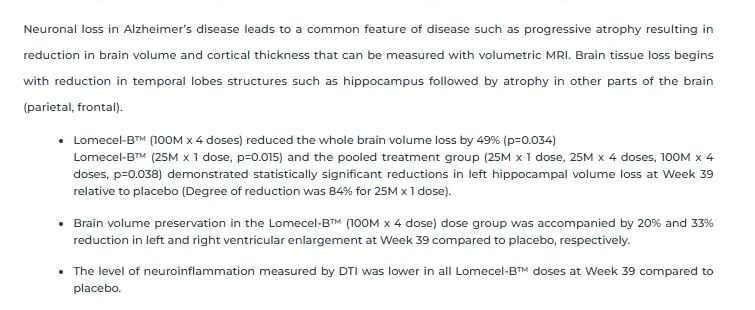 在本次研究中,科学家们测试了三种不同剂量的Lomecel-B以及安慰剂的效果,主要考察的是治疗的安全性,同时次要考察指标包括复合阿尔茨海默症评分(CADS)从研究开始到第39周的变化。此外,还探索了脑容量和认知功能等其他指标。