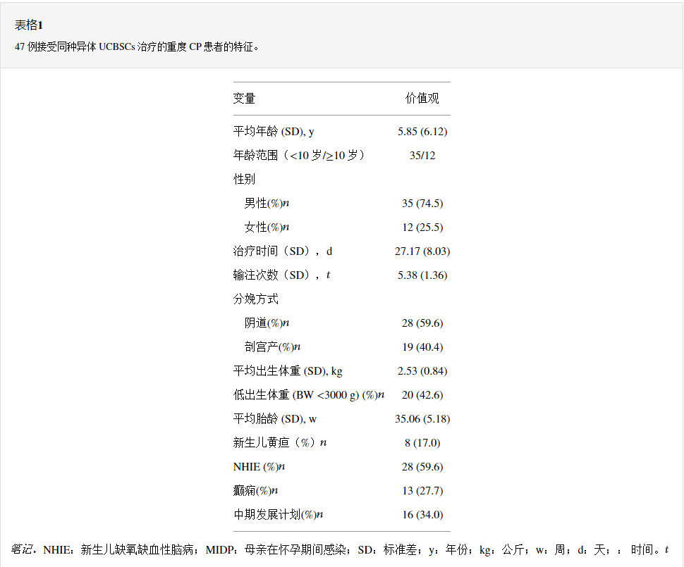 人群:本研究纳入2009年8月至2012年12月在广东省中医院接受异基因脐带血干细胞治疗的47例重症脑瘫患者。