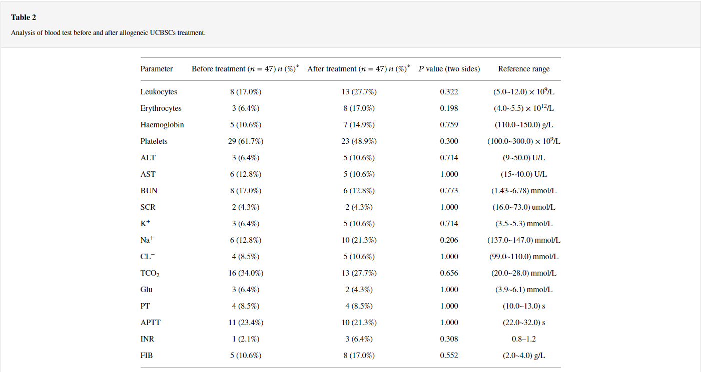 验血结果异常的患者人数(百分比);UCBSCs:脐带血干细胞;ALT:丙氨酸氨基转移酶;AST:天冬氨酸氨基转移酶;BUN:血清尿素氮;SCR:血清肌酐;K +:血清钾;Na +:血清钠;CL –:血清氯离子;TCO 2:总二氧化碳;Glu:血清葡萄糖;PT:凝血酶原时间;APTT:活化部分促凝血酶原激酶时间;INR:国际标准化比率;FIB:纤维蛋白原。