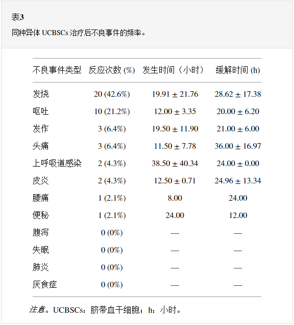 不良事件:异基因脐带血干细胞输注后不良事件发生频率的分析表明存在一些非致命性不良事件。在最初的静脉输注中没有不良事件。所有不良事件均发生在鞘内注射的休息期间。47名患者中有26名(55.3%)报告了不良事件,但未发生人员伤亡。