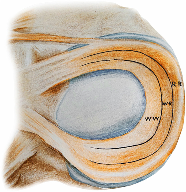 R-R,红-红;R-W,红白;W-W,白白。R-R区血供良好,如果撕裂很小,有时可以自行愈合,不一定需要手术治疗。R-W区供血部分,自愈能力低。W-W区几乎没有血液供应,该区域的撕裂不会自行愈合。
