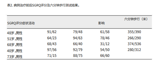 肺功能指标改善:2 例慢性阻塞性肺疾病在应用重组人粒细胞集落刺激因子动员干细胞治疗 2 ~ 3 周期后 CAT 评分、圣乔治评分、COPD 综合评分等生活质量评分及 FEV 1 、FEV 1 / pred改善程度较小。
