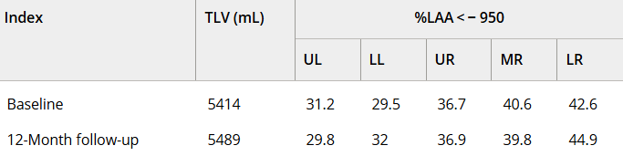 影像学检查:对于患者 #2902,定量分析显示基线时总体肺气肿面积比为 12.75%,移植后 24 周降至 10.02%。在患者 #8009 中,肺气肿面积比值从基线的 10.85% 下降到移植后 12 周的 9.08%。CT 图像的三维可视化显示,肺气肿的减轻在下叶比在上叶更明显。