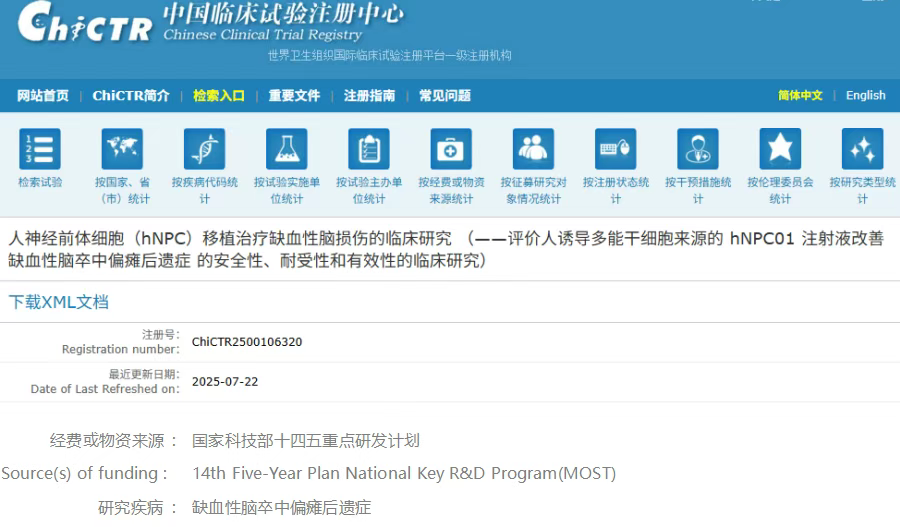 近日,解放军总医院第七医学中心正式注册启动 “人诱导多能干细胞(iPSC)来源神经前体细胞(hNPC01)移植治疗缺血性脑卒中偏瘫后遗症”I期临床试验(注册号:ChiCTR230007XXXX)。该研究获国家科技部 “十四五”重点研发计划专项支持,是国内首个探索iPSC衍生神经前体细胞治疗卒中后运动功能障碍的注册临床项目,为480万中国卒中致残患者带来功能重建新希望。