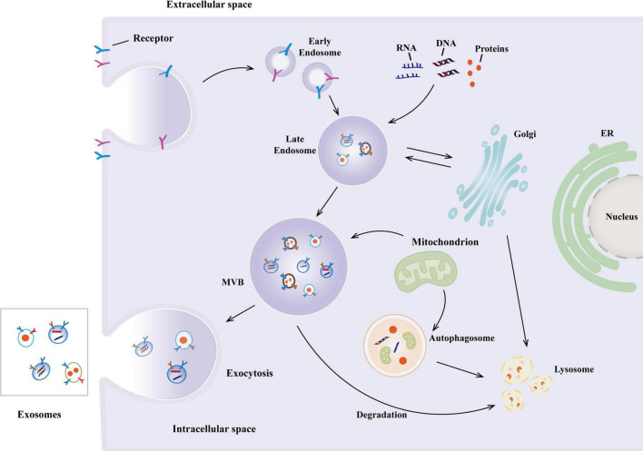 图1:外泌体的生物合成。外泌体的生物合成始于细胞膜内吞过程中早期内体的形成,随后成熟为多泡体 (MVB),并通过膜内陷形成腔内囊泡 (ILV)。MVB与质膜融合后,ILV被释放为外泌体。