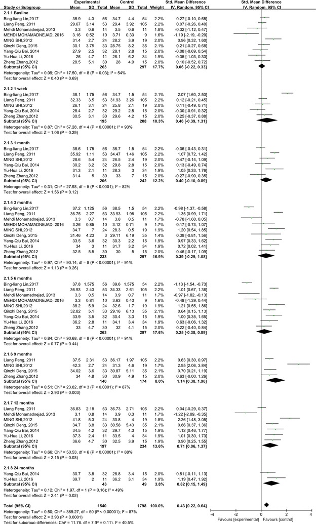 Cochrane 图书馆、OVID、EMBASE和PUBMED被检索到2017年12月。评估慢加急性肝衰竭患者干细胞治疗的随机和非随机研究均被纳入。结果指标是总胆红素 (TBIL)、丙氨酸转氨酶 (ALT)、国际标准化比值 (INR)、白蛋白 (ALB) 和终末期肝病模型 (MELD) 评分。