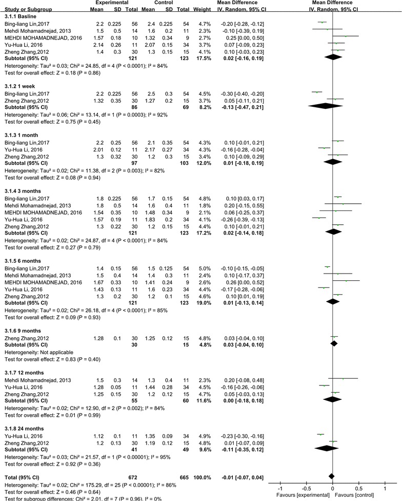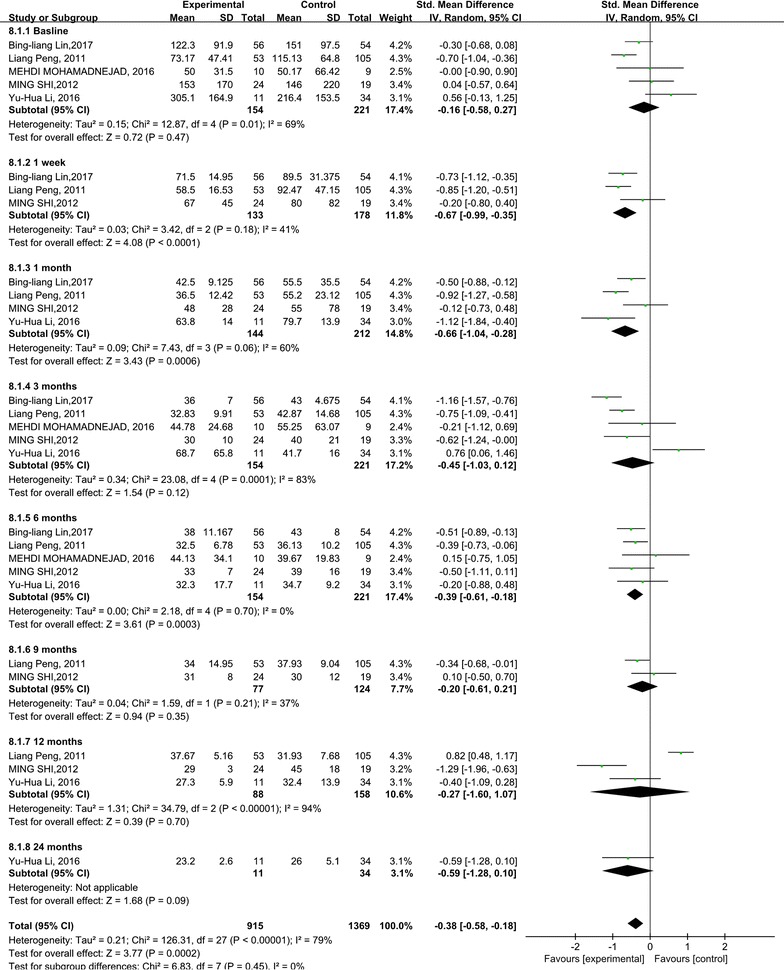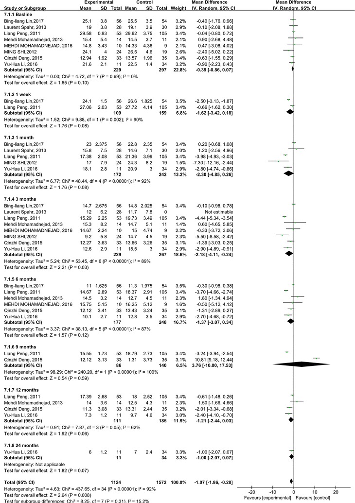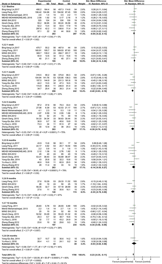 与对照组相比,干细胞治疗后ALT水平显着降低(p<0.00001)(图5)。亚组分析显示,干细胞治疗组ALT水平也有所降低,在1周、1个月和6个月时间点均低于基线和相应对照组。干细胞治疗后9、12和24个月时ALT水平无显着差异。关于1周、6和9个月时的ALT水平,未发现异质性。但是,应考虑1、3和12个月时 ALT水平的异质性。但这只能通过一两项研究来解释。