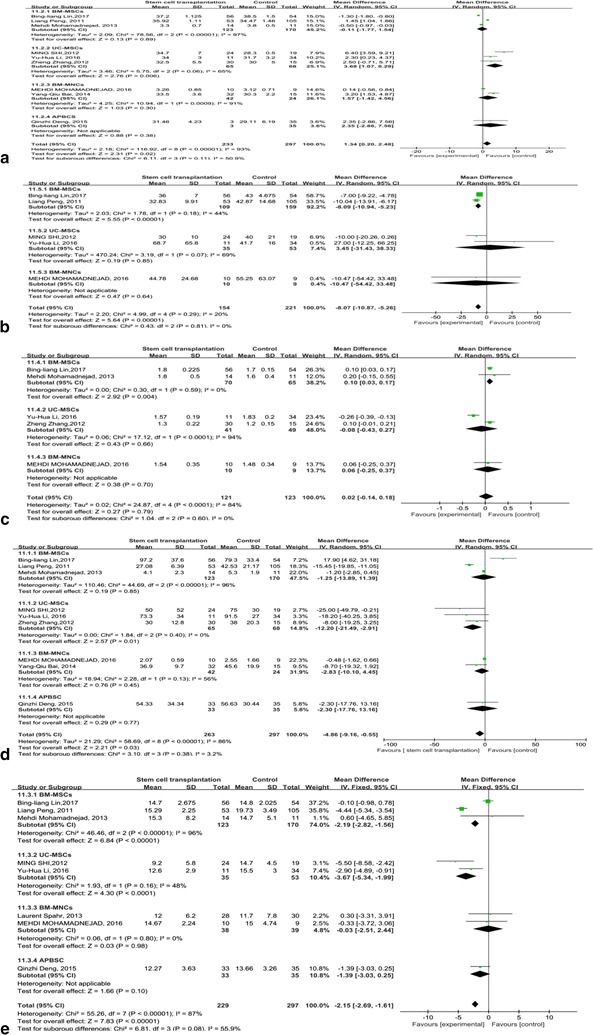 MELD评分主要用于评估终末期肝病的预后。我们观察到干细胞治疗组和对照组的MELD评分均有所下降。干细胞治疗组和对照组之间存在显着差异 (p =0.008)(图6)。此外,尽管进行了亚组分析,但这些研究的异质性很高 (I 2 : 62–100%)。但这也可以仅通过一两项研究来解释。