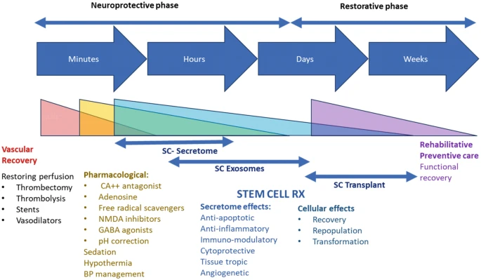 在过去40年中,药物性神经保护策略的失败迫使我们寻求新的治疗手段。随着血管内取栓术(thrombectomy)经验的积累,干预时间窗正逐步基于灌注参数而延长。干细胞疗法有望为超出取栓时间窗或不适合该治疗的患者带来新的希望。