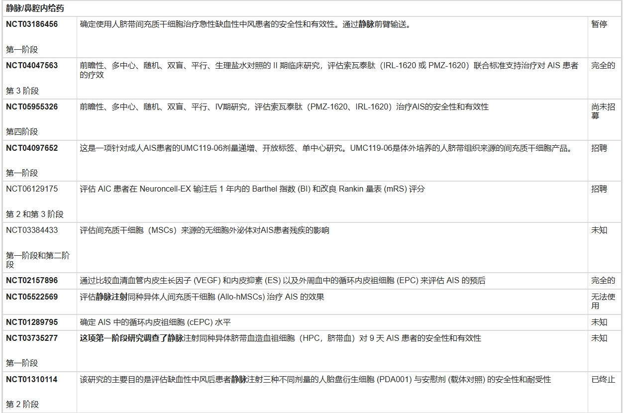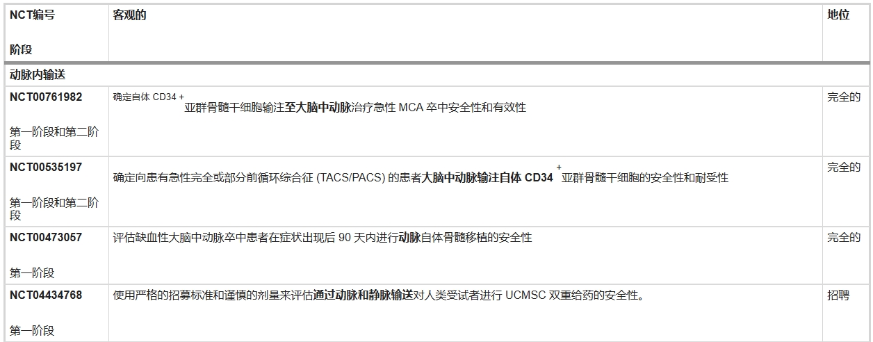 表3列出了国家临床试验注册中心网站上报告的正在进行的急性缺血性中风干细胞试验。