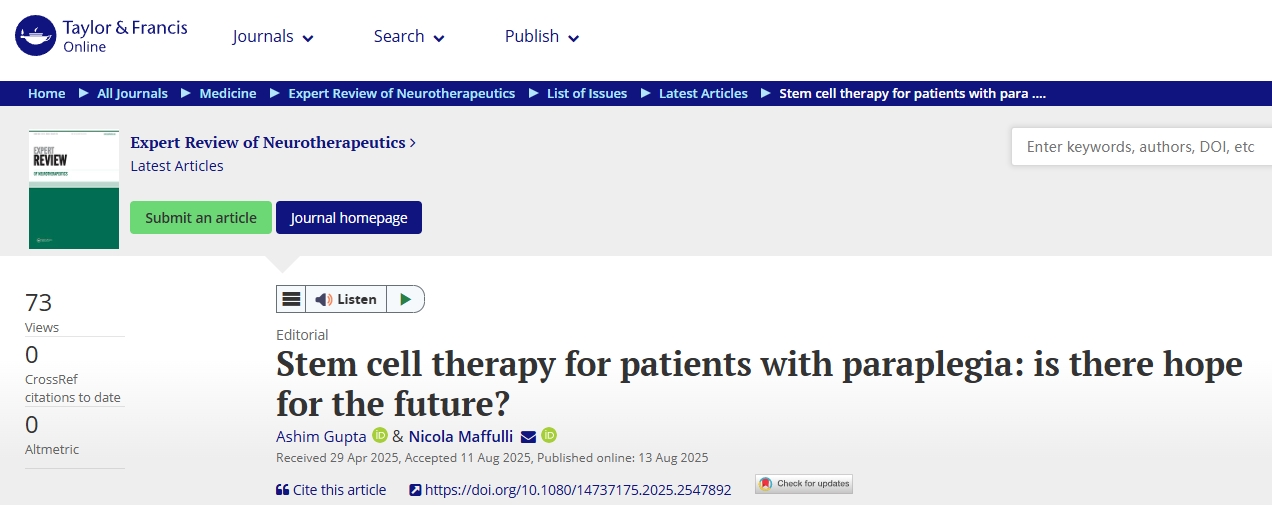 主要参考资料:Gupta, A., & Maffulli, N. (2025). Stem cell therapy for patients with paraplegia: is there hope for the future? Expert Review of Neurotherapeutics, 1–7. https://doi.org/10.1080/14737175.2025.2547892