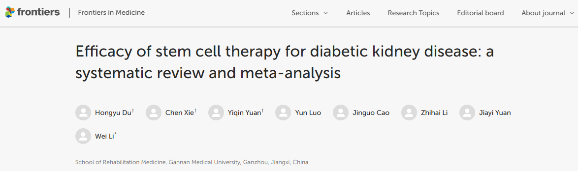 [1]:Du H, Xie C, Yuan Y, Luo Y, Cao J, Li Z, Yuan J and Li W (2025) Efficacy of stem cell therapy for diabetic kidney disease: a systematic review and meta-analysis. Front. Med. 12:1601900. doi: 10.3389/fmed.2025.1601900