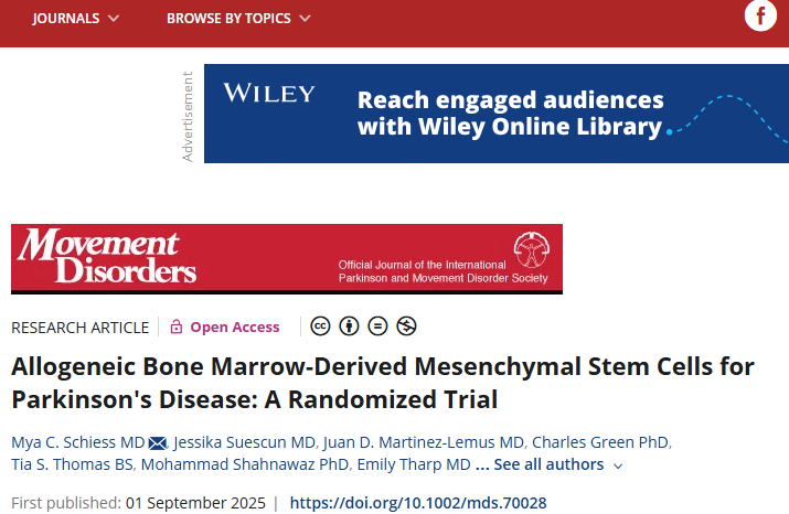为验证该假设,我们牵头开展了一项II期双盲、随机、安慰剂对照试验,旨在评估重复allo-hMSC输注对改善PD患者运动及非运动症状的疗效。(研究结果发表在期刊杂志《运动障碍主页》上)[2]。