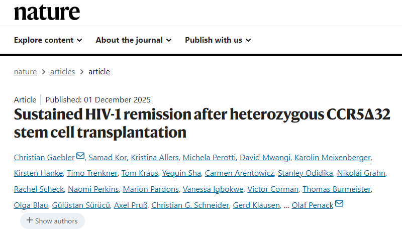 [1]Gaebler, C., Kor, S., Allers, K. et al. Sustained HIV-1 remission after heterozygous CCR5Δ32 stem cell transplantation. Nature (2025). https://doi.org/10.1038/s41586-025-09893-0