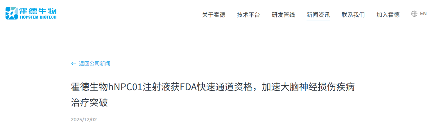 12月2日,霍德生物宣布,公司自主研发的国际首款人前脑神经前体细胞注射液(hNPC01)获得了美国食品药品监督管理局(FDA)授予的快速通道资格(Fast Track Designation, FTD),用于治疗缺血性脑卒中导致的长期运动功能障碍。[2]