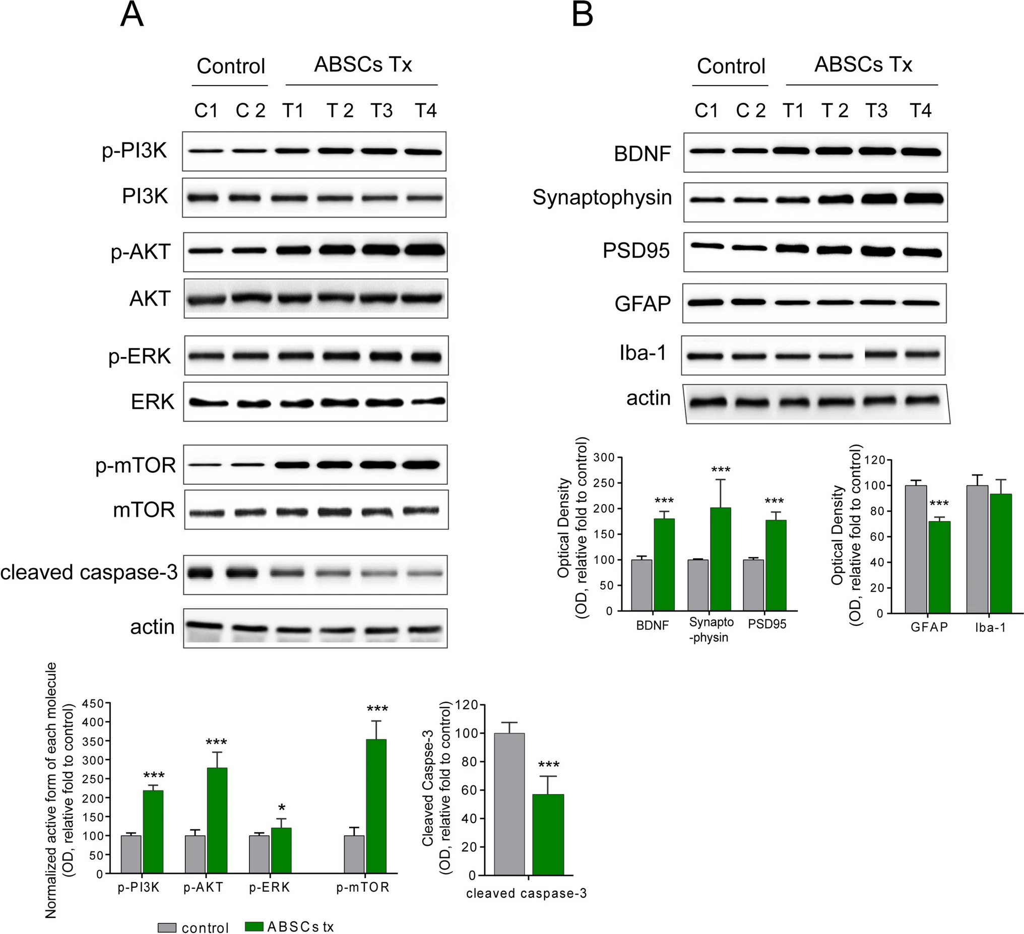 在ABSCs联合生长因子治疗阿尔茨海默病患者中,生长因子与生存信号通路活性增强的核心表现为关键神经保护通路的显著激活以及突触相关蛋白的上调。