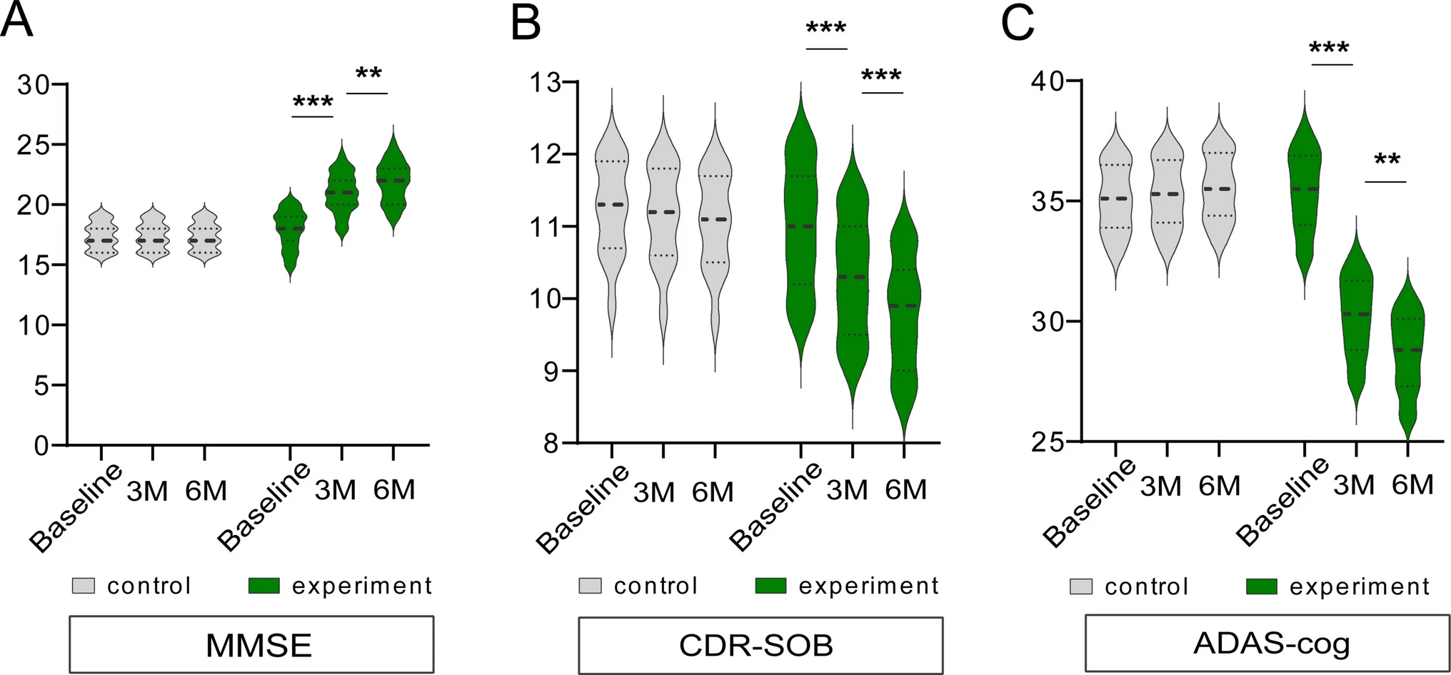 - 临床结局:主要使用简易精神状态检查量表、临床痴呆评定量表-总分和阿尔茨海默病评估量表-认知子量表,在基线、治疗后3个月和6个月评估认知功能。