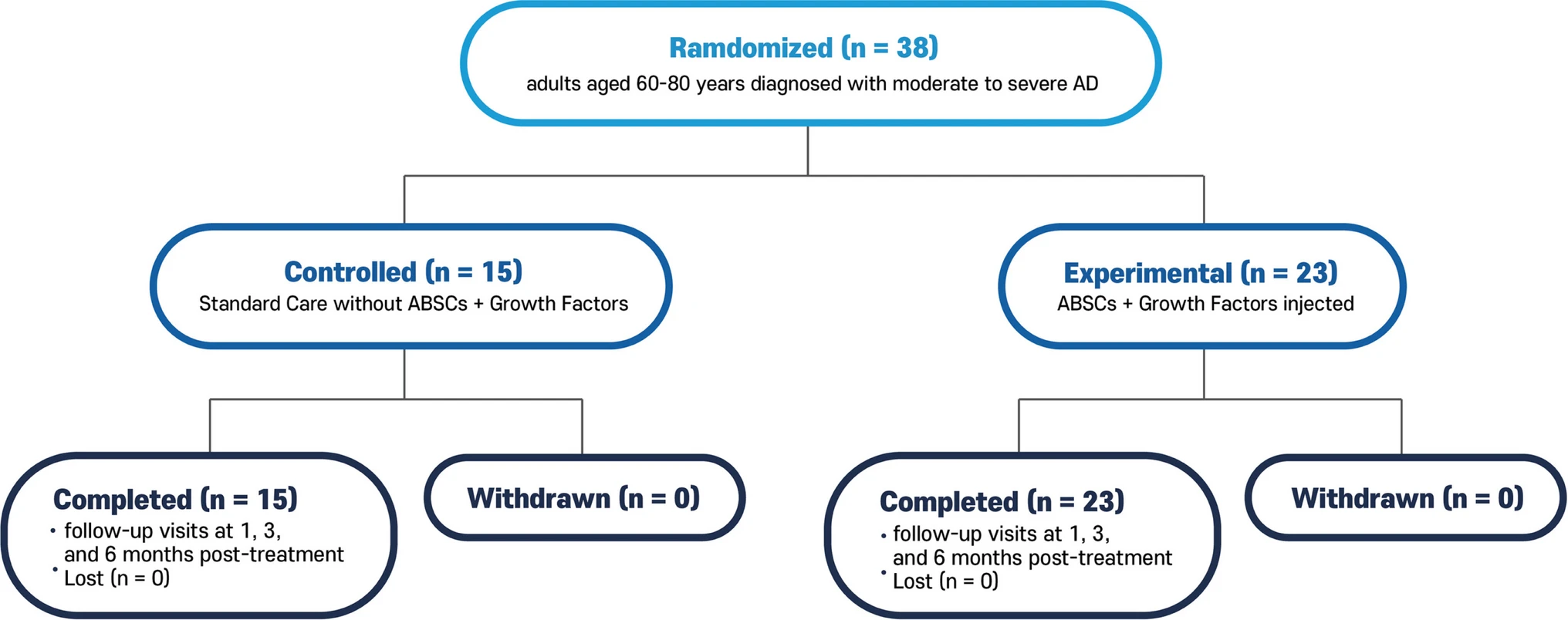 研究对象与干预措施:纳入年龄60–80岁、经临床及β-淀粉样蛋白PET-CT确诊的中重度AD患者。受试者随机分为两组:实验组接受ABSCs联合生长因子(BDNF、VEGF、IGF-1)静脉输注;对照组仅接受标准药物治疗。ABSCs取自患者外周血,经密度梯度离心与流式细胞术鉴定后新鲜制备,于3小时内回输,不予体外扩增。生长因子按标准化剂量配制。全疗程共进行3次输注,每次间隔4周。