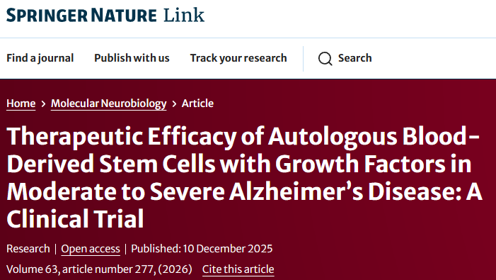 参考资料:[1]:Lee, W.J., Cho, K., Lee, D. et al. Therapeutic Efficacy of Autologous Blood-Derived Stem Cells with Growth Factors in Moderate to Severe Alzheimer’s Disease: A Clinical Trial. Mol Neurobiol 63, 277 (2026). https://doi.org/10.1007/s12035-025-05583-0