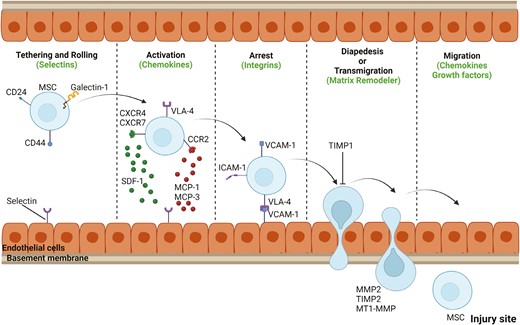 间充质干细胞的系统性归巢包括五个不同的步骤,包括黏附和滚动、激活、细胞停滞、渗出或跨内皮迁移以及迁移。