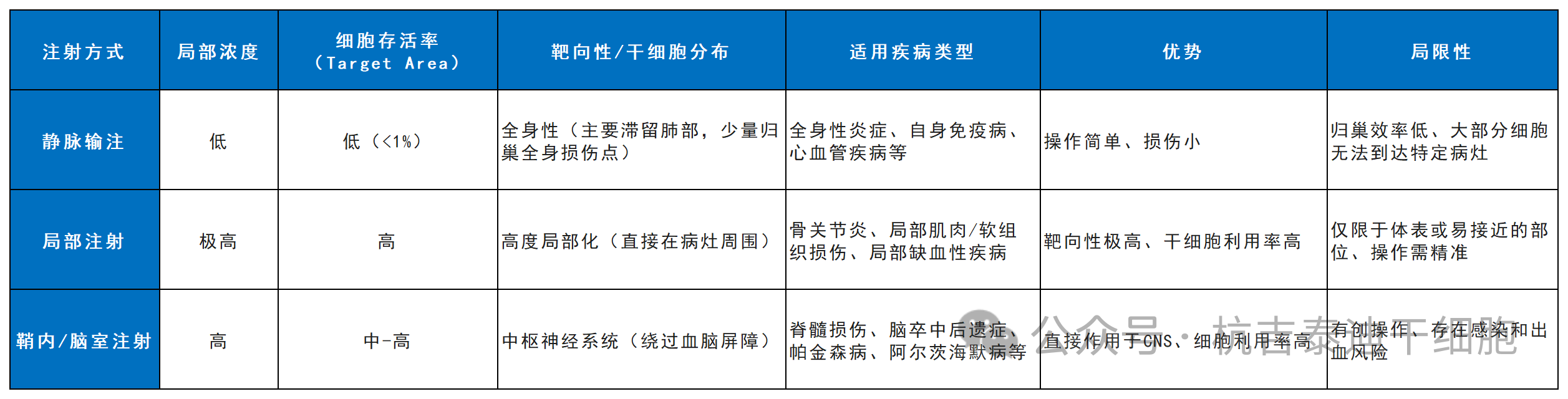 是的,注射方式是疗效的“战略决策”。它直接决定了干细胞的初始分布、存活率和作用模式(表1)。