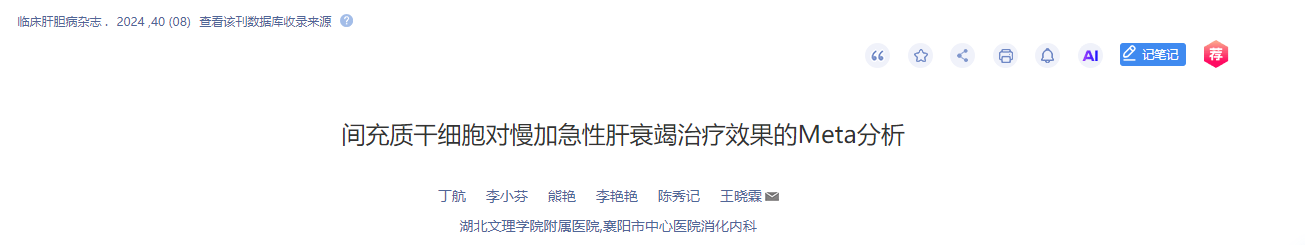 2024年8月25日,湖北文理学院附属医院联合襄阳市中心医院在期刊《临床肝胆病杂志》上发表了一篇名为《间充质干细胞对慢加急性肝衰竭治疗效果的Meta分析》的研究成果。[1]