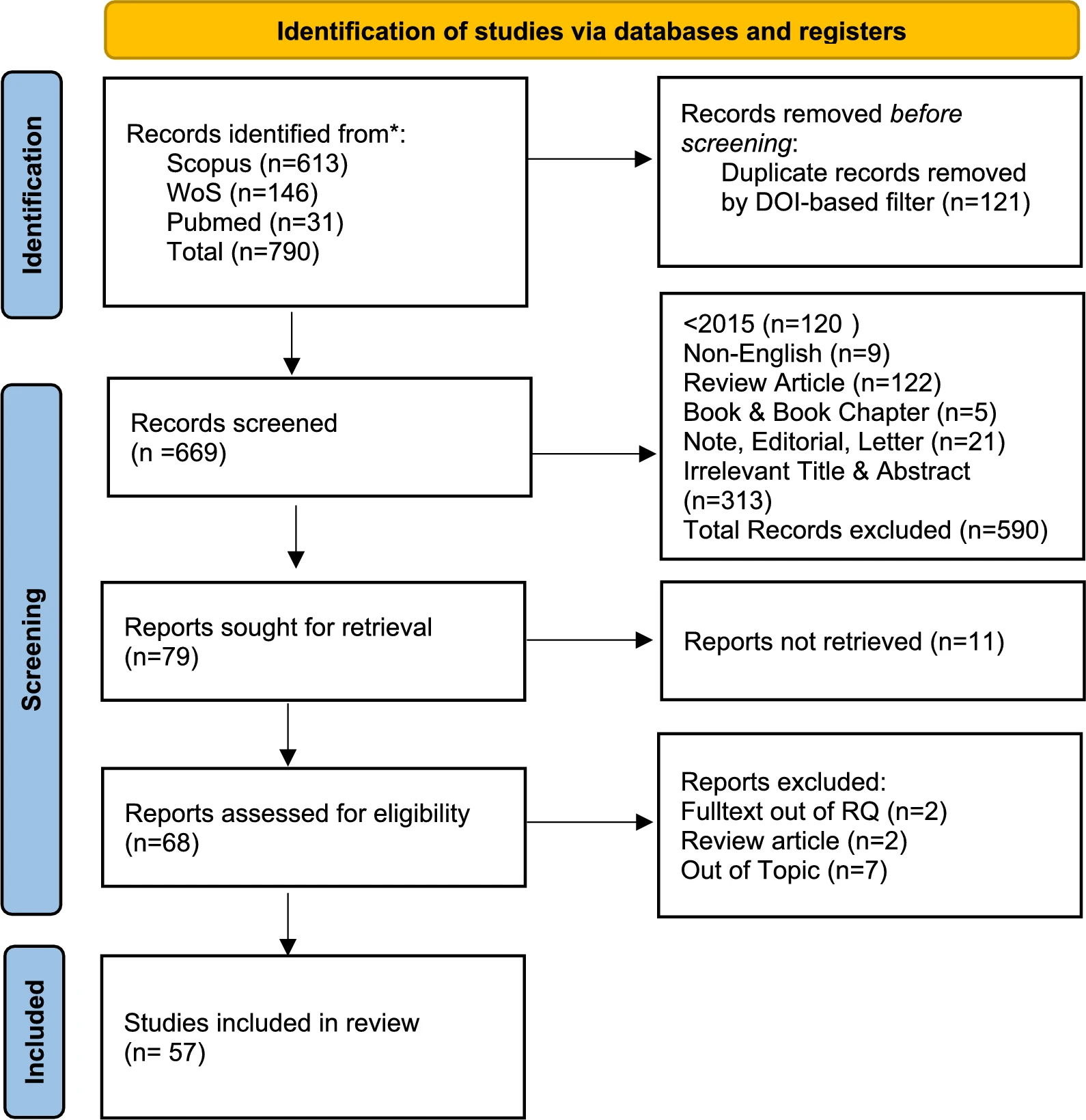 本系统综述通过检索Scopus、Web of Science和PubMed三大数据库,共识别出790篇相关文献(图1)。经自动去重程序(匹配DOI、标题、作者和年份等字段)剔除121篇重复文献后,剩余669篇独立文献进入标题‑摘要筛选阶段。
