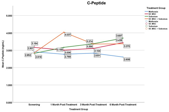 - 二甲双胍组与UC-MSC组:在整个随访期内均未观察到C肽的显著变化。