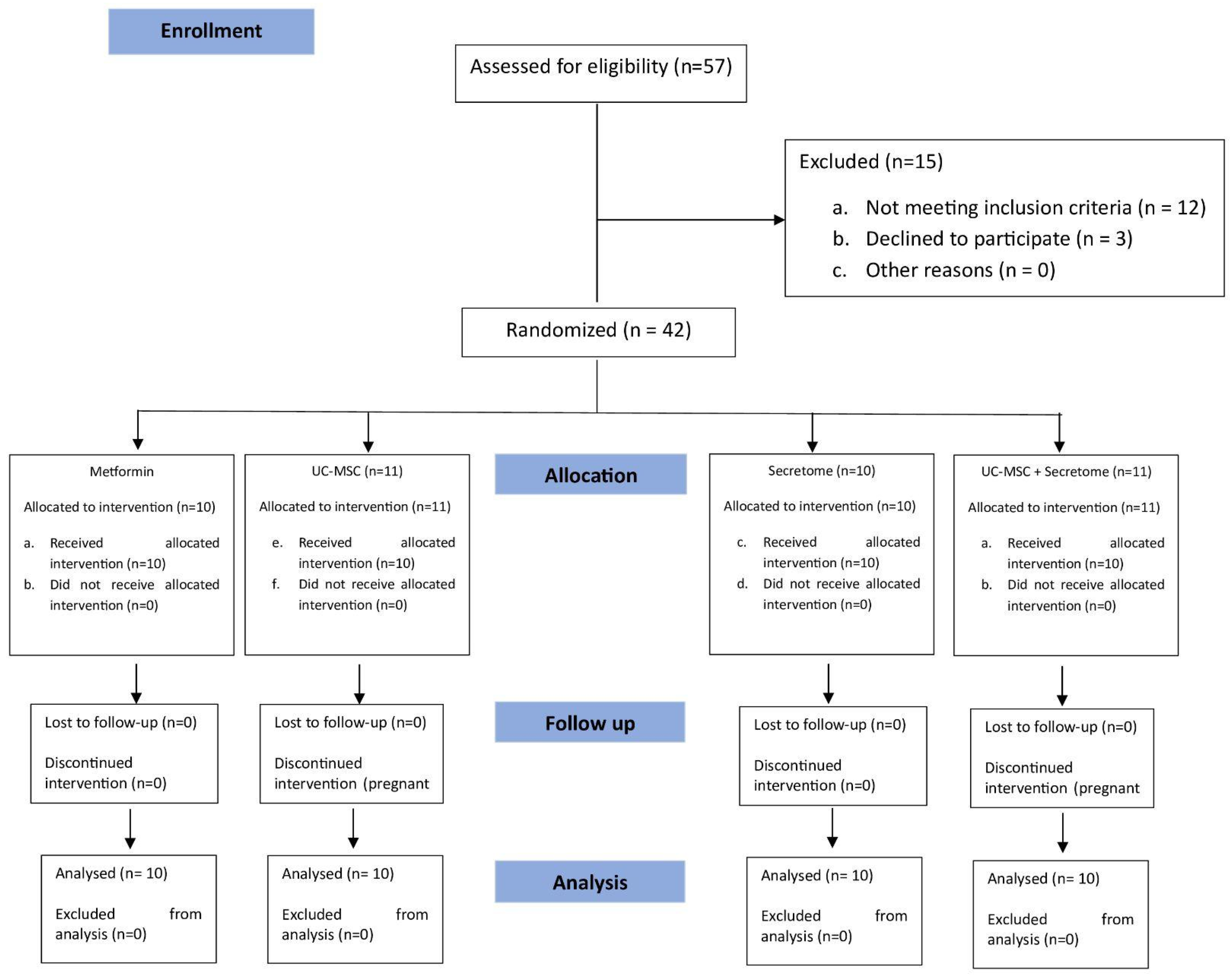 这项研究是一项随机对照试验,将40名符合鹿特丹诊断标准的PCOS女性平均分为四组:二甲双胍组、脐带间充质干细胞(UC-MSC)组、分泌组以及UC-MSC联合分泌组。所有受试者均完成了为期6个月的随访,依从性良好。