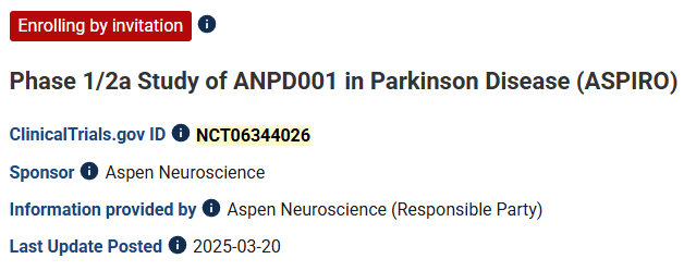 关于ASPIRO试验:ASPIRO是一项首次在人体中进行的多中心、开放标签1/2a期临床试验 (NCT06344026),旨在评估Sasineprocel (ANPD001) 在50至70岁帕金森病患者中的安全性、耐受性和初步疗效。该疗法源自患者自身的皮肤成纤维细胞,经重编程为iPSC后分化为多巴胺能神经元前体细胞,并通过MRI引导下的精准手术移植回患者脑内。